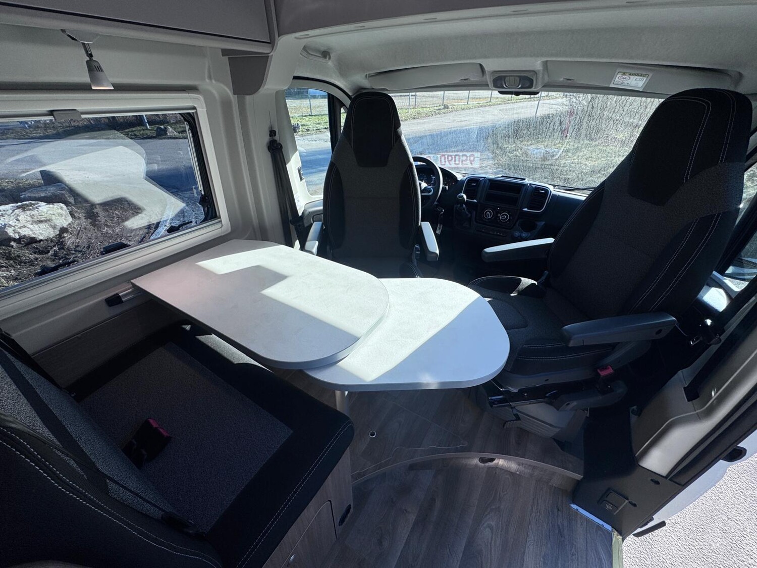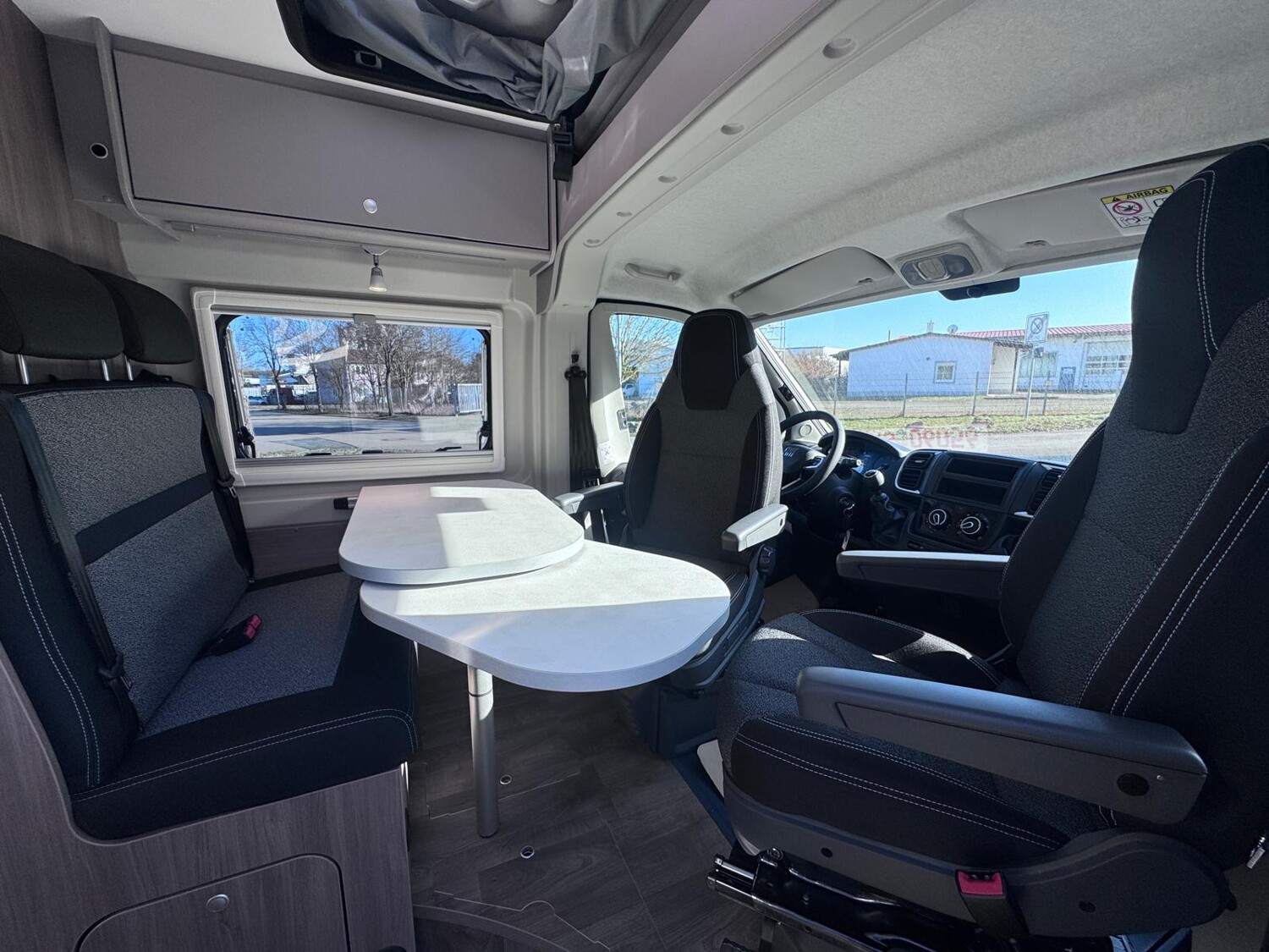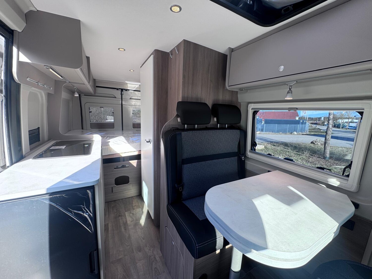• Basic Paket (Dachhaube Midi Heki 70 x 50 cm über Sitzgruppe, Duschausstattung, Fenster im Bad, Kleiderstange in der Nasszelle, Breite Einstiegsstufe, Drehplatte für Tischerweiterung an der Sitzgruppe)