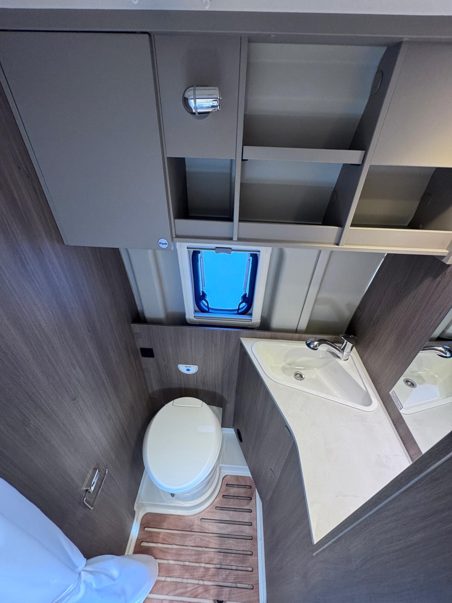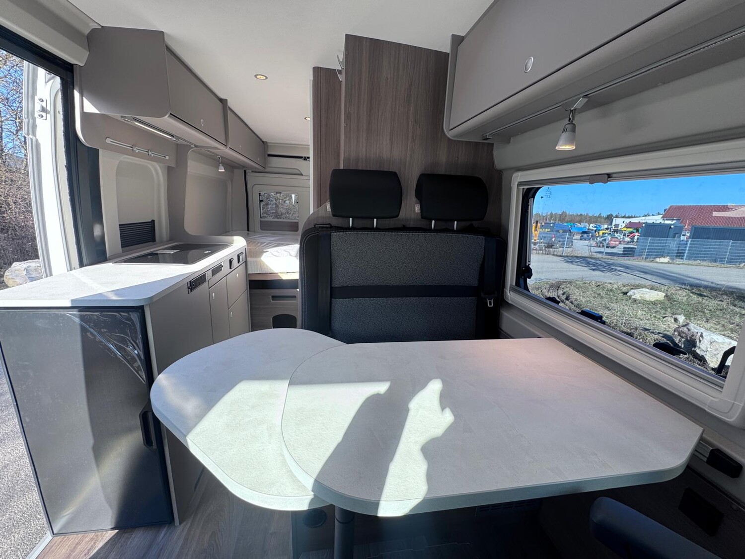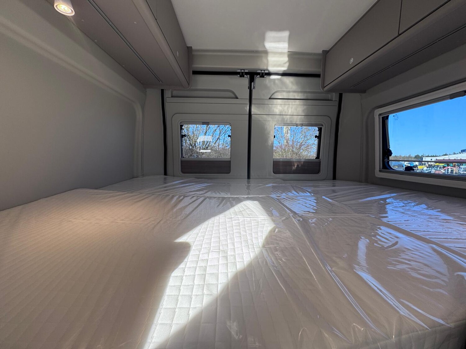 • Basic Paket (Dachhaube Midi Heki 70 x 50 cm über Sitzgruppe, Duschausstattung, Fenster im Bad, Kleiderstange in der Nasszelle, Breite Einstiegsstufe, Drehplatte für Tischerweiterung an der Sitzgruppe)