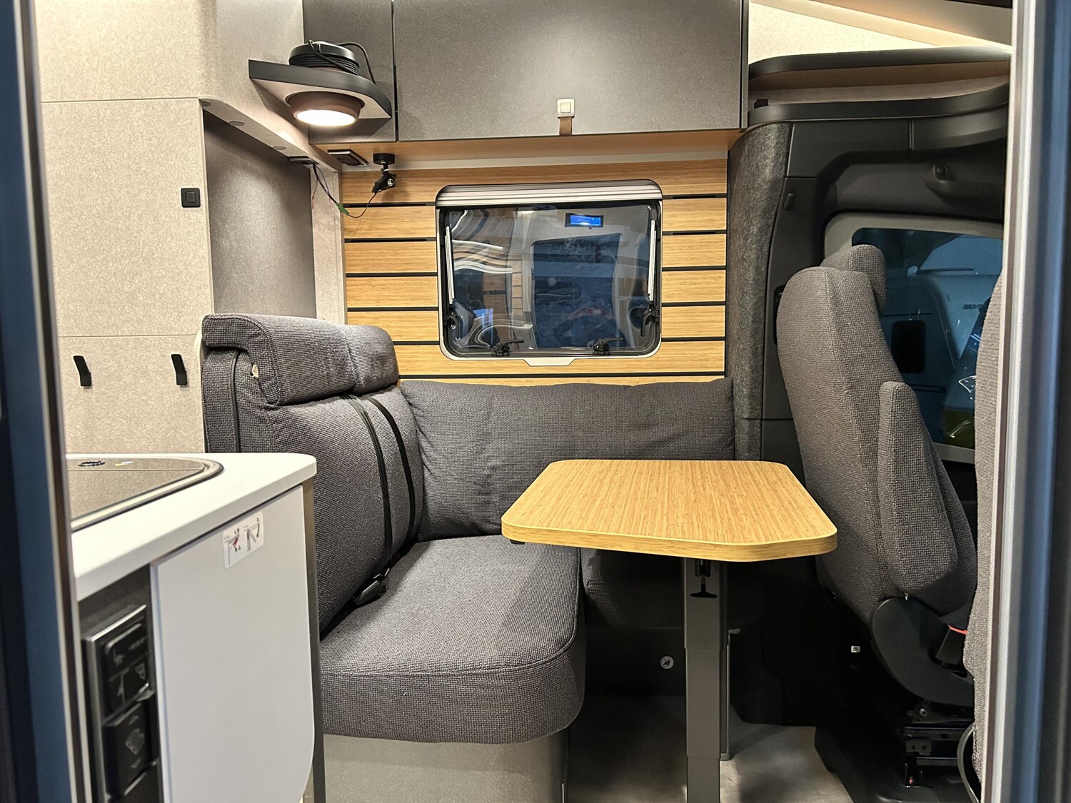 • Bettenbau für Komfort L-Sitzgruppe inkl. Zusatzpolster und absenkbarem Tisch unter Einbeziehung des Fahrersitzes